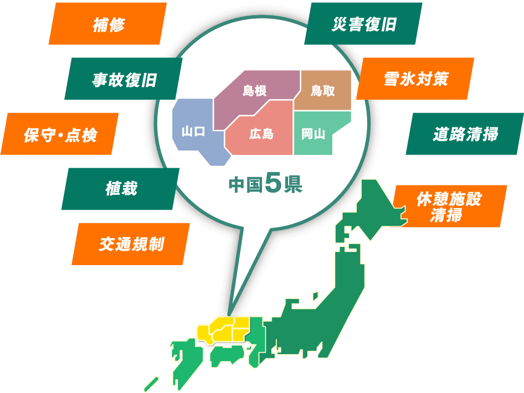 NEXCO西日本のグループ会社として、メンテナンス中国が担っているのが高速道路の「メンテナンス業務」。